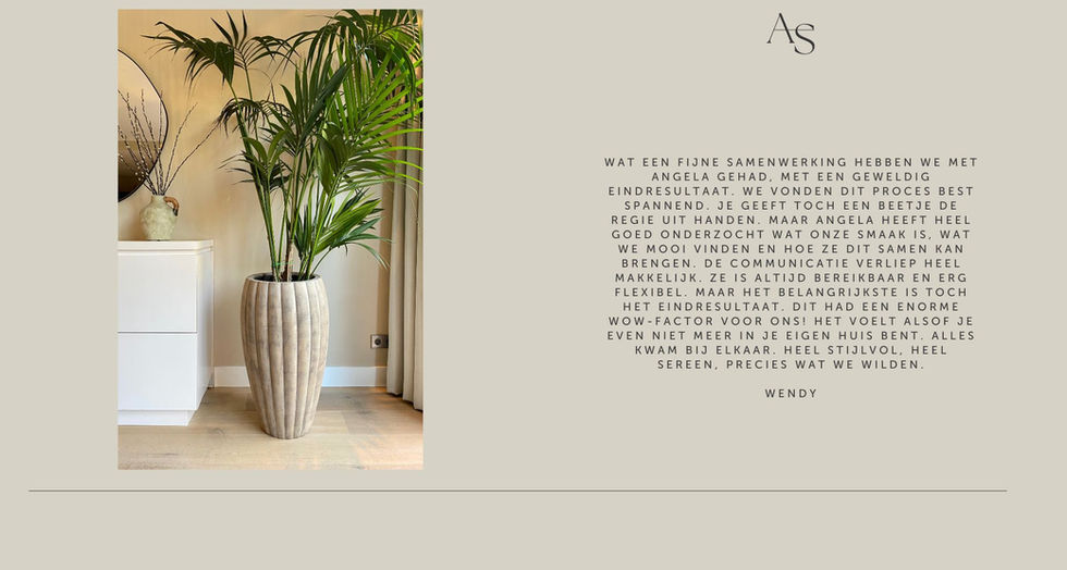 I OFTEN HEAR FROM MY CUSTOMERS THAT THEY KNOW WHAT THEY LIKE BUT THEY ARE NOT ABLE TO TURN IT INTO A COMPLETE LOOK. THEREFORE, MY MISSION WITH ANGELA STRUIJK INTERIOR DESIGN IS TO TRANSLATE THE WISHES OF MY CUSTOMERS INTO BALANCED AND HARMONIOUS VISIONS WITH AN EMPHASIS ON CREATING WARM SPACES WITH THE USE OF BEAUTIFUL MATERIALS, NATURAL TONES, GORGEOUS FABRICS AND BOLD OBJECTS.